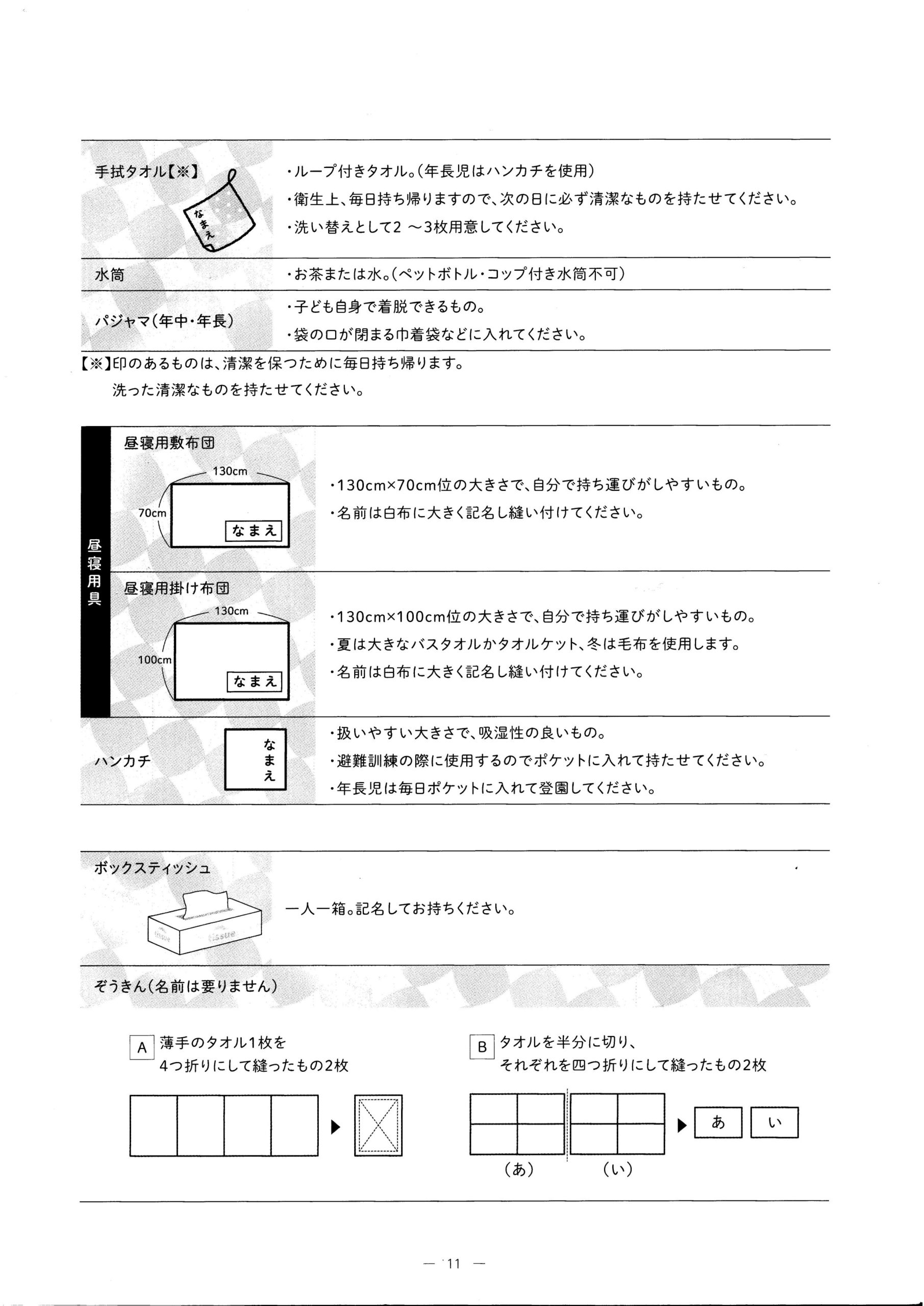 | ハンカチ | ・扱いやすい大きさのもの ・年少では持たせず、年長からとする園などもあり |