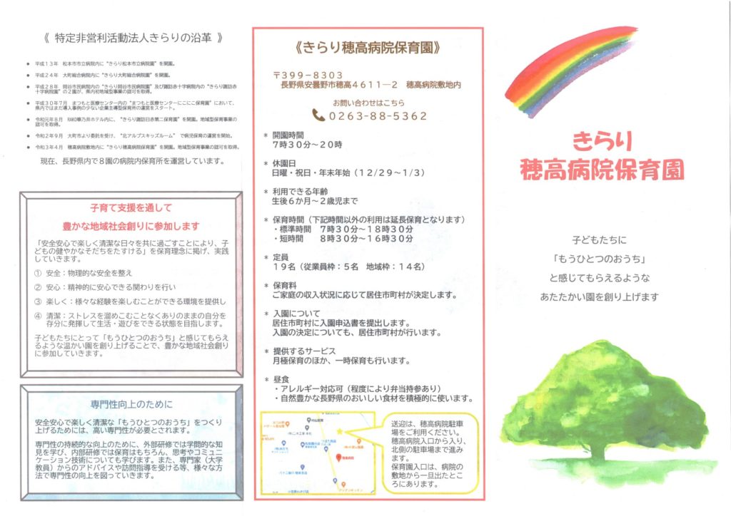 | きらり穂高病院保育園 | 穂高4611-2 | 私立 | - | 19 | 19 | - | - | - | 6ヶ月~2歳児 | 7:30~20:00 | 〇 | 〇 | ? | 2021.4.1 |