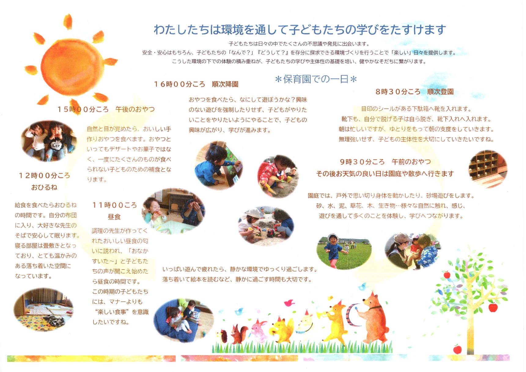 | 安曇野シュタイナー こども園おひさま | 穂高有明9068-1 | 認可外 | 特 | 11 | 2 | 3 | 3 | 3 | 3歳児~ | 8:30~14:00 | - | - | 水のみ | 2015.6.1 |