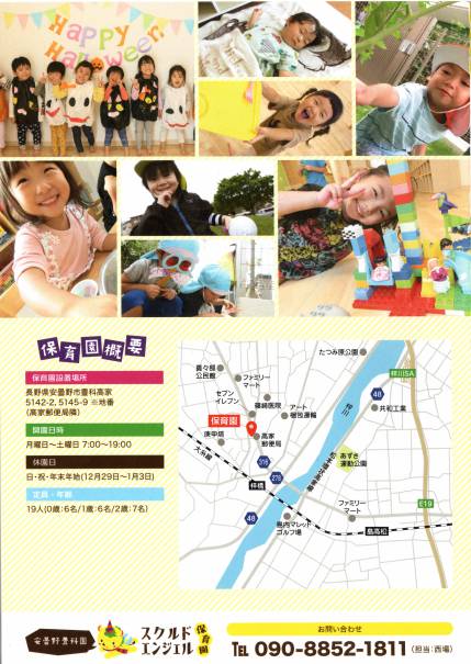 | スクルドエンジェル保育園 安曇野豊科園 | 豊科高家5142-2 | 私立 | - | 19 | 19 | - | - | - | 3ヶ月~2歳児 | 7:00~19:00 | 〇 | - | 毎日 | 2023.4.1 |
