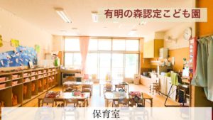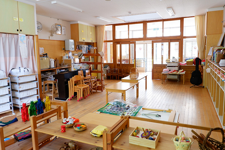 公立園と違って園内は上履き不要。家と同じ様に裸足や靴下で過ごすなどアットホームな雰囲気。園内に調理室があり、園児の育てた野菜を使った給食だったり、園児のリクエスト献立の日があったりと食育にも力をいれているとのこと。