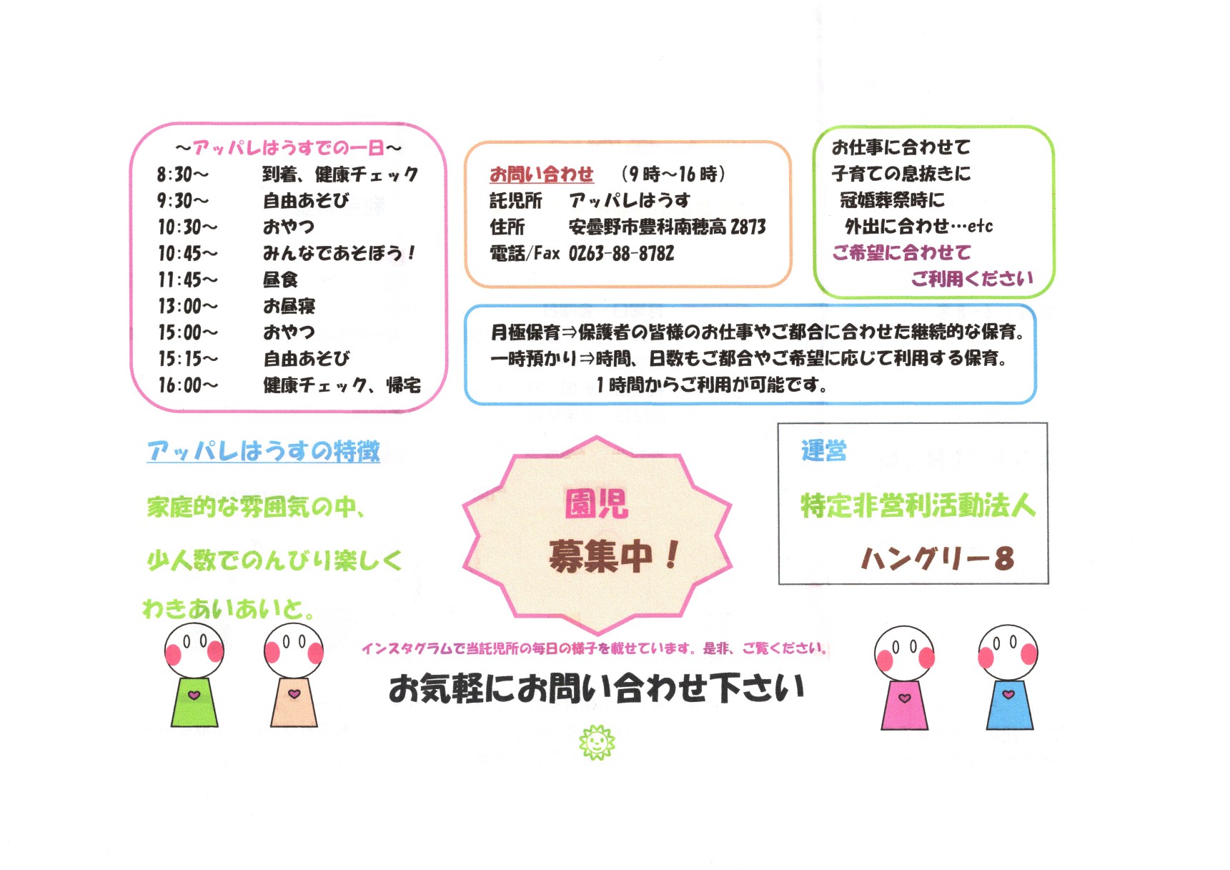 | アッパレはうす | 豊科南穂高2873 | 認可外 | - | 8 | 8 | - | - | - | 0歳児~2歳児 | 8:30~16:00 | ? | ? | - | ? |