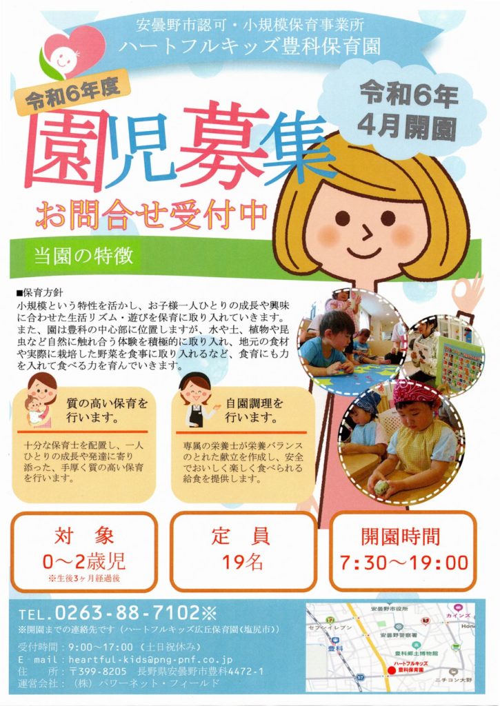 | ハートフルキッズ 豊科保育園 | 豊科4472-1 | 私立 | - | 19 | 19 | - | - | - | 3ヶ月~2歳児 | 7:30~19:00 | 〇 | ? | 毎日 | 2024.4.1 |
