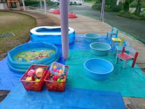 育児室から出れる中庭にビニールプールを準備されている様でした。
