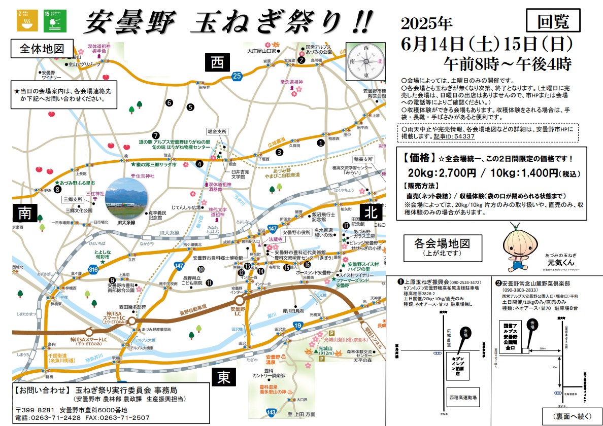 会場には安曇野玉ねぎシンボルキャラクターの「元気くん」の旗等がたてられているので分かると思います。各会場近くでは交通誘導がされてたりするので、それに従います。(※路上駐車は厳禁です!)