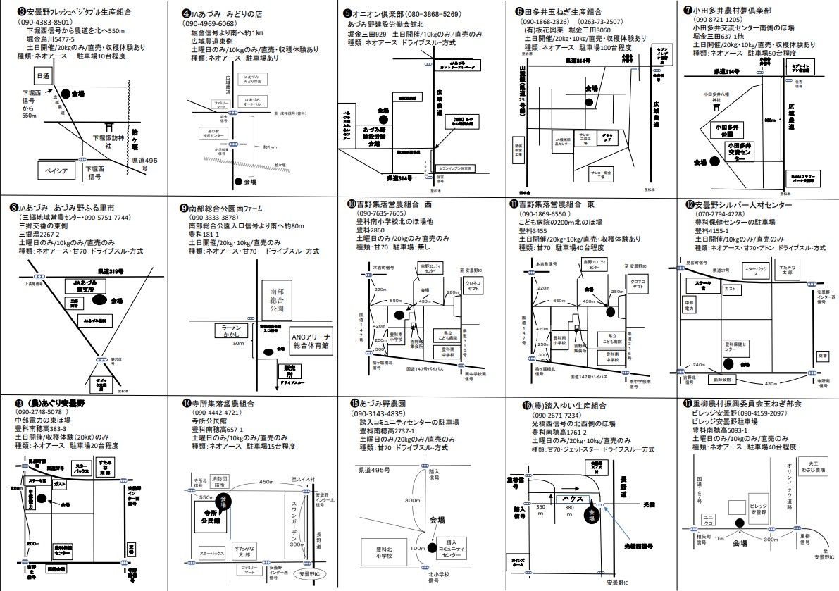 | 15 | あづみ野農園 | 〇 | × | × | 〇 | × | 豊科南穂高2737-1 | 踏入コミュニティーセンターの駐車場 |