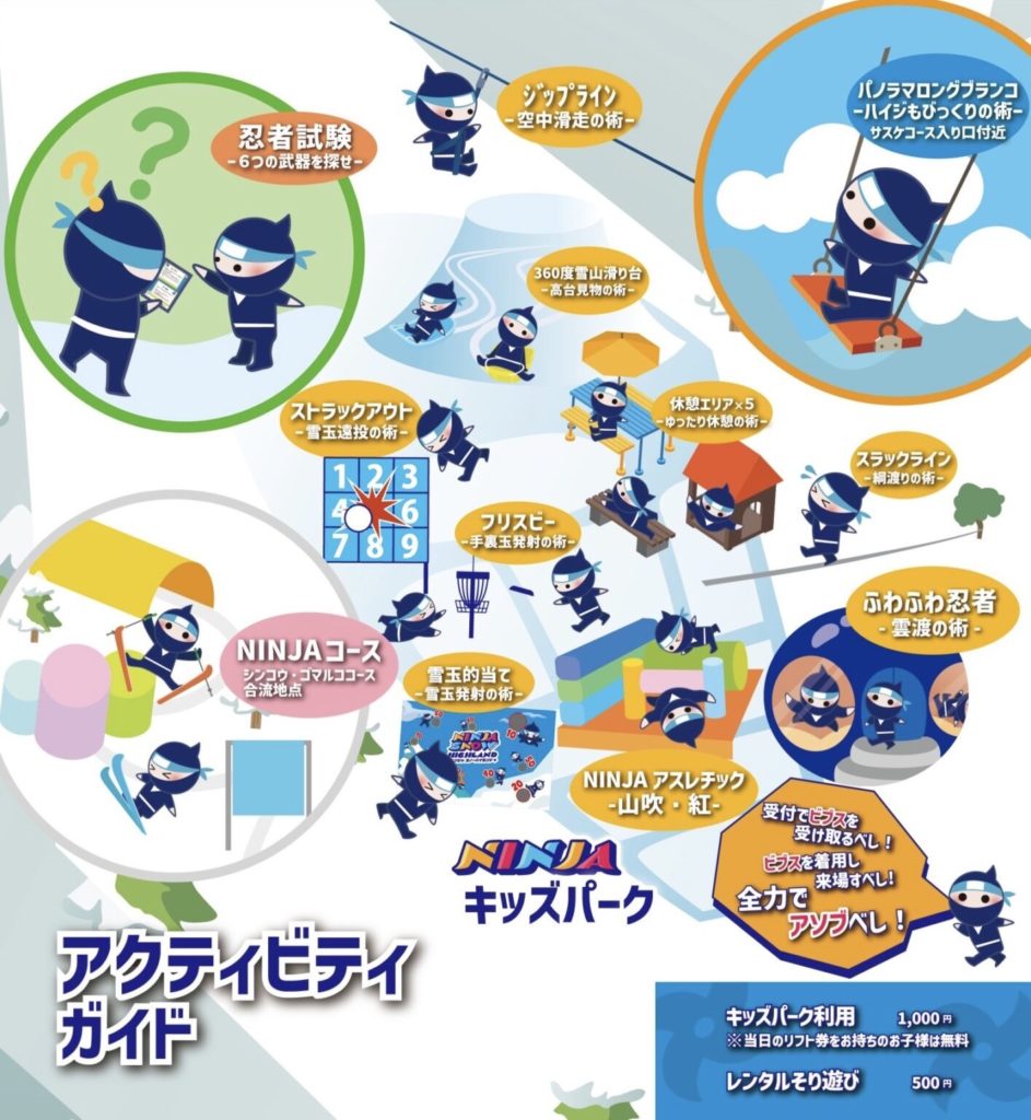 スキー場としてはリフト数は2、コースは10のみですが、利用料1000円(リフト券所持者無料)の【NINJAキッズパーク】があり、滑り台の他にもふわふわ遊具やスラッグライン、ストラックアウト等の遊びが可能になっています。