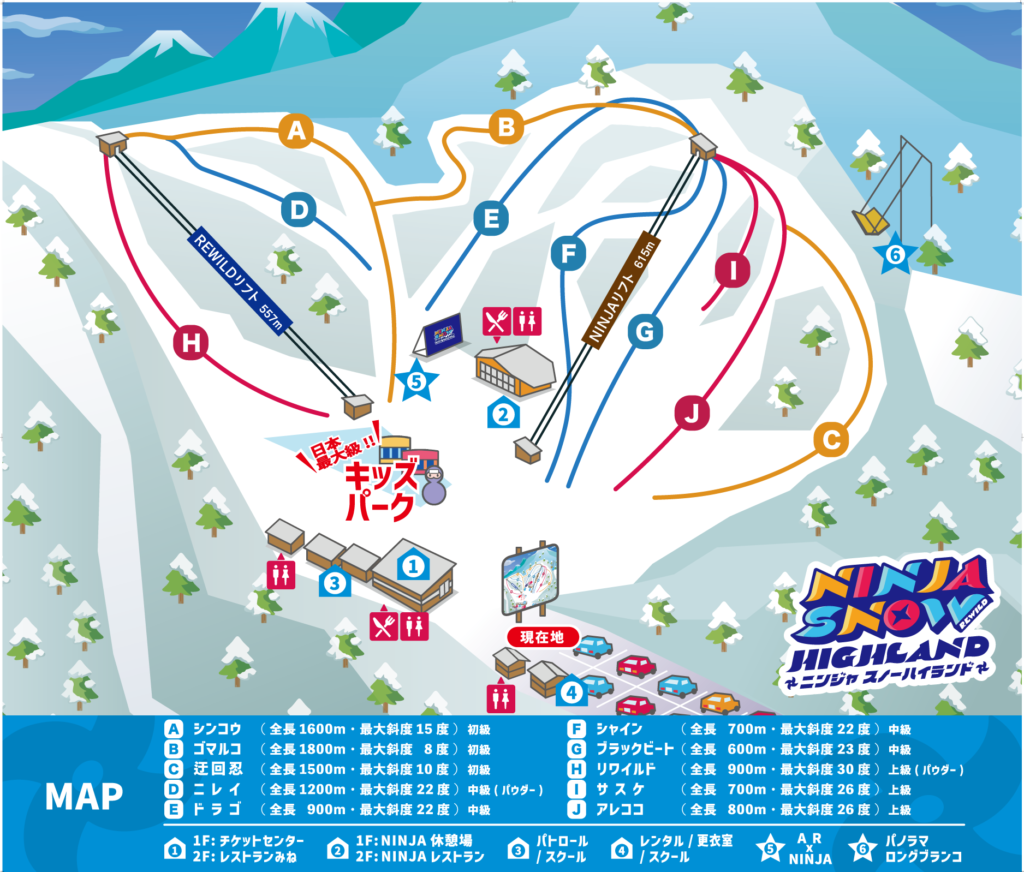安曇野ICから須坂長野東ICまで高速利用で1時間15分程(高速から降りて35分程)となるリワイルドニンジャスノーハイランドは家族で楽しめるスノーレジャースポットを目指し、滑る以外にも30種以上の遊びが楽しめる様になっているスキー場です。