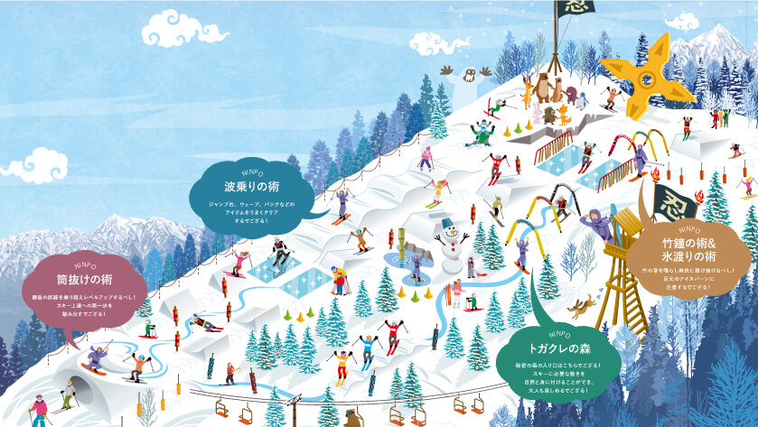 第4ペアリフトを上った先には波乗りや壁渡り、トンネルくぐりなど色々なコースを忍者の様に滑ることに挑戦できる忍者スロープが子供に人気です。