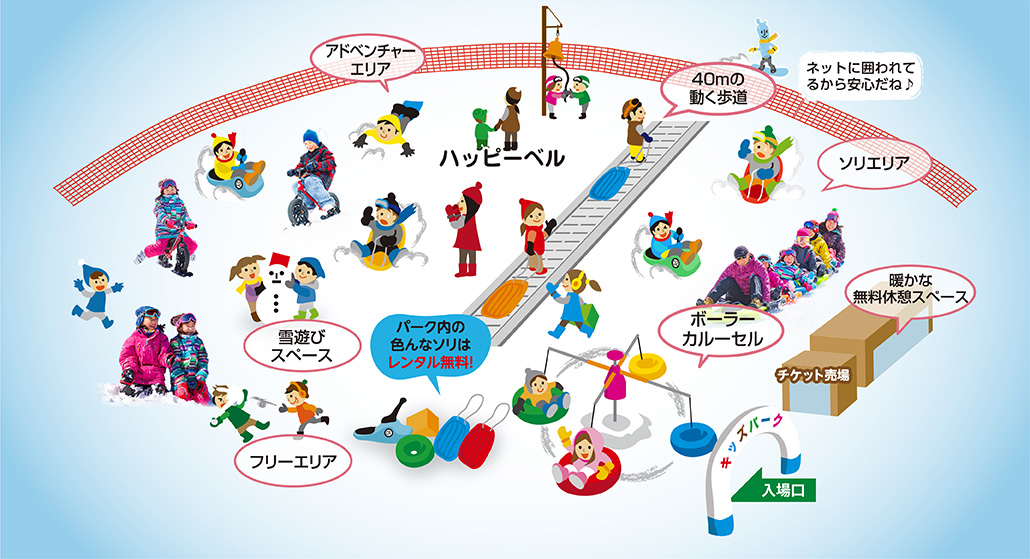 3歳以下無料、小学生1000円、中学生以上1500円(小学生以下の付き添いの大人は2名まで500円/人)のキッズパークがあり。入場料は掛かるが入ればソリやチューブ、ストライダーなどの遊具を無料で使用できる。(スノースクートやスノードライブは2.5h2000円要)。動く歩道もあるのでソリ遊びも楽々。