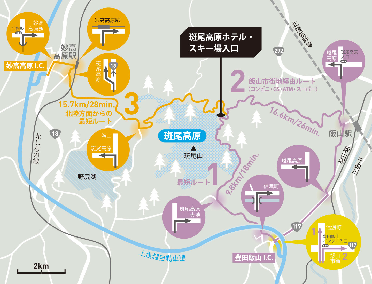 なお、MAP上の最寄りは豊田飯山ICになりますが、少し狭い雪道を通ることになるのでスキー場のオススメは信濃町ICで降りて野尻湖脇を回って上るルートになっています。