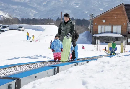 スキー場入口付近に開設される【キッズパーク】は未就学児も含め利用には500円/人(1日券以上のリフト券所持者は300円)掛かりますが、動く歩道があり、楽にスキーやスノーボード、ソリ遊び等が可能です。(ソリは持込orレンタル(800円))