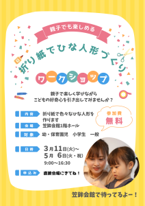 予約不要、参加費無料で幼・保育園児~一般まで折り紙色々なひな人形が作れるみたいなので、アートパーク側の雛飾り鑑賞に合わせていってみるととても楽しめそうです。
