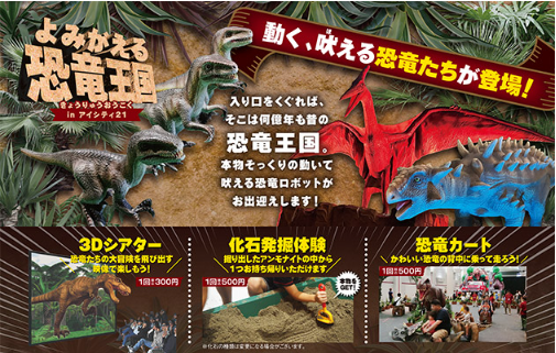安曇野ICから車で30分程の松本・井上アイシティ21の春休みイベントとして3/15(土)~4/6(金)「よみがえる恐竜王国」が開催されます。
