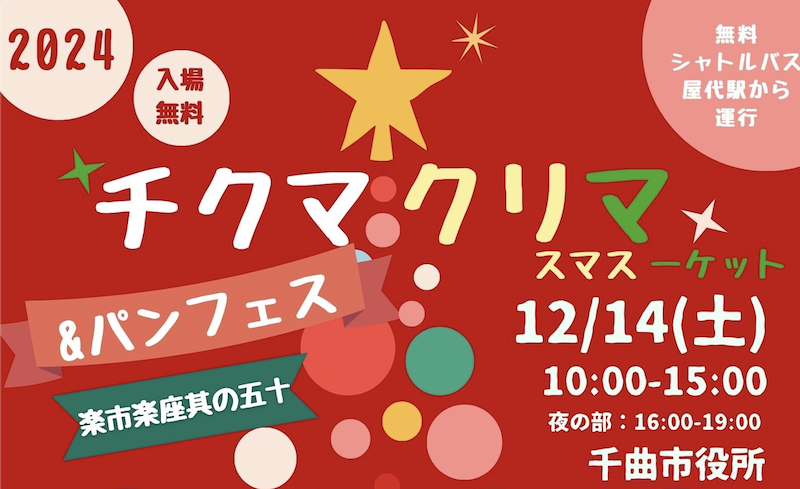 安曇野ICから更埴ICまで高速利用で40分程の千曲市市役所ガレリアやこもれびてらす等のスペースを利用し、今年も「チクマクリスマスマーケット&パンフェス2024with楽市楽座其の五十」が開催されます。