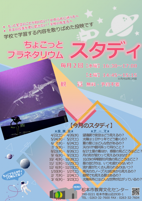 松本市教育文化センターでは毎月2回に参加費無料、予約不要で先着90名様程となりますが、学校で学習する内容を散りばめた投映する鑑賞出来るイベントを開催しています。
