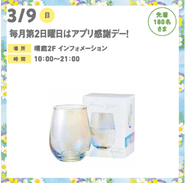 また毎月第2日曜日はアプリ感謝デーということで、晴庭2Fインフォメーションにてイオンモールアプリから二次元コードを読み取ってスタンプをGETすると先着180名に「オーロラグラス」のプレゼントもあるようなので要チェックです。