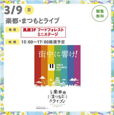 イオンモール松本の春庭3F吹抜け北側で、3/9(日)15時~17時、「楽都・まつもとライブ」が開催され素敵な生演奏を楽しめます。
