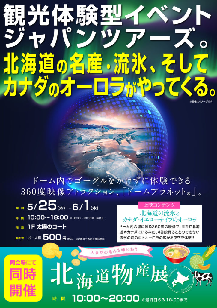 安曇野ICから車で1時間程の上田市アリオでは5/25(木)~6/1(木)の期間、ドーム内で360度の映像を楽しめる映像アトラクションに北海道物産展が開催されます。