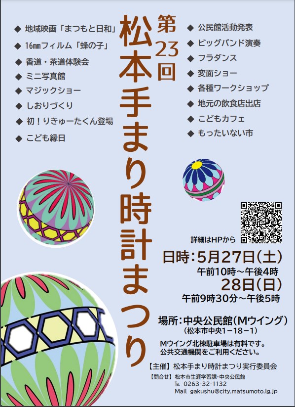 - 5/27(土)-28(日) 第25回松本手まり時計まつり@松本市Mウィング