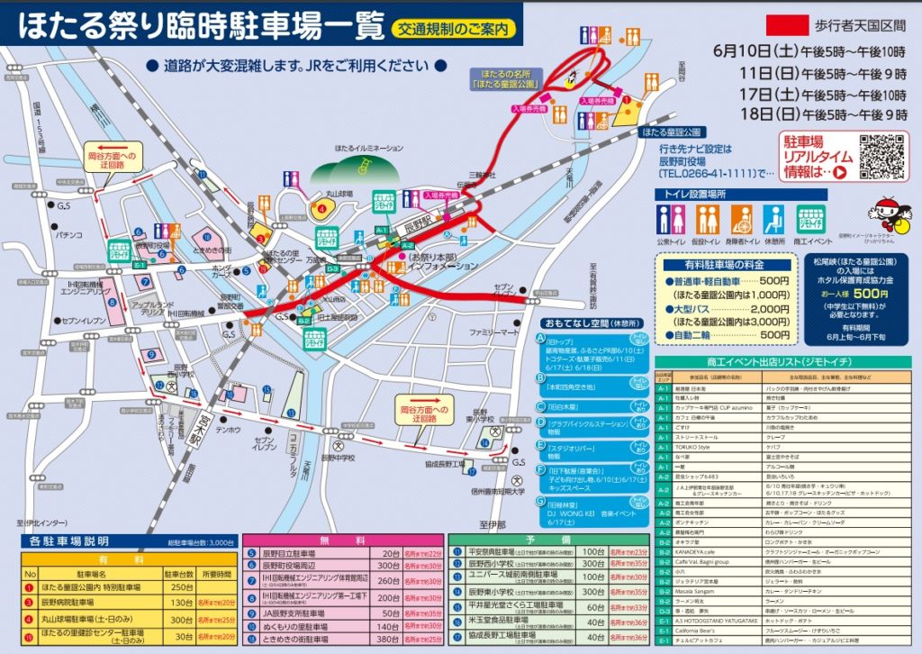 ※ほたる童謡公園駐車場(1000円)の他、有料駐車場(500円)、無料駐車場の設営等があります。⇒駐車場情報