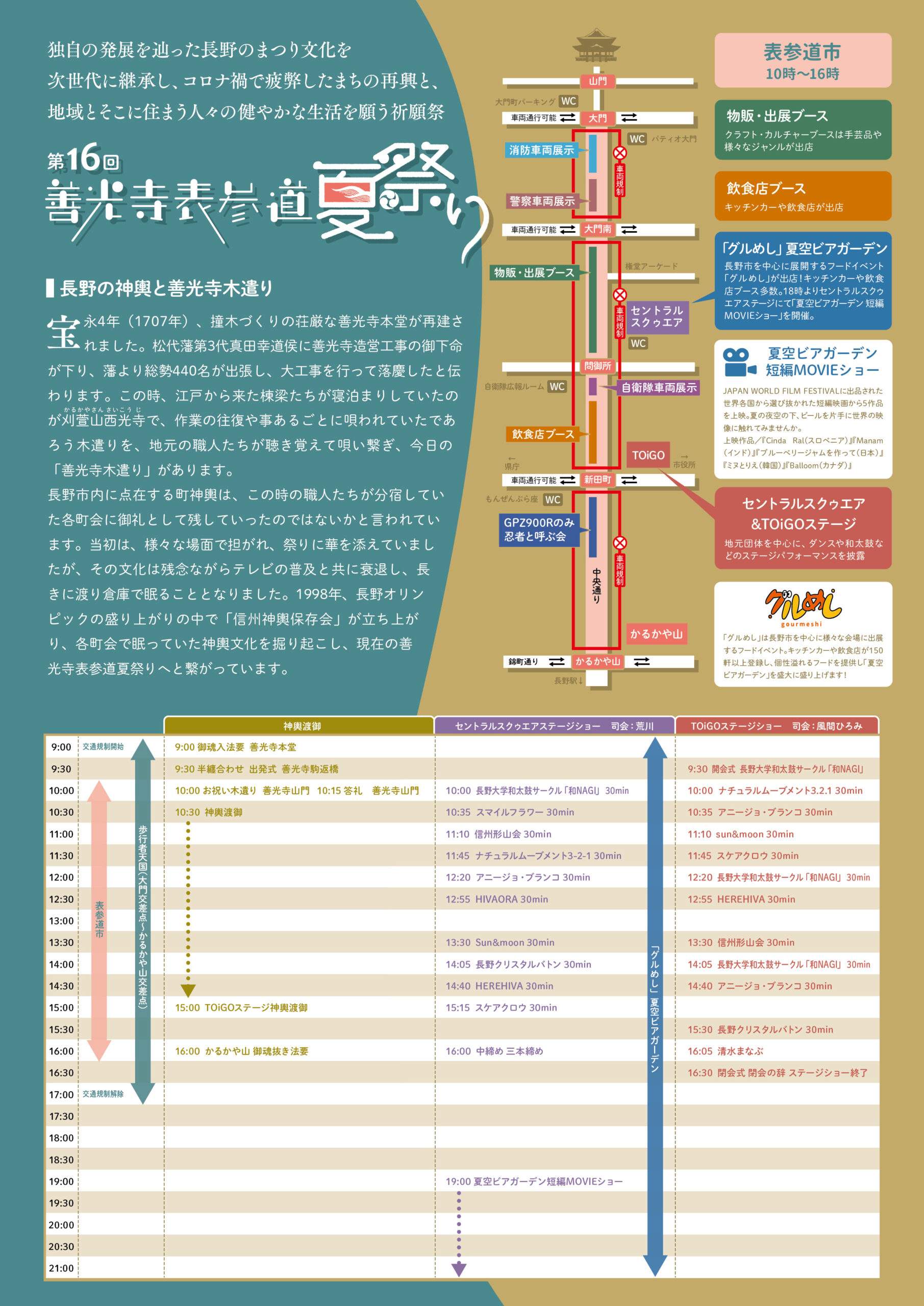 お祭りでは、善光寺大門からかるかや山までの中央通りを歩行者天国にして、神輿や和太鼓等のパフォーマンスがある他、夏空ビアガーデン、キッチンカー等での飲食物販売、クラフト等の展示販売など、様々な催しが予定されています。