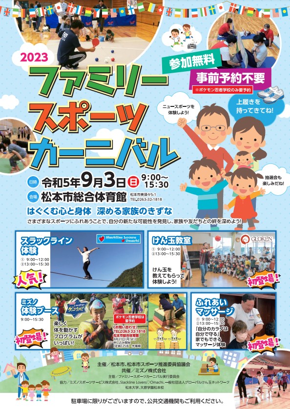 安曇野ICから車で約30分の松本市総合体育館で9/3(日)9:00~15:30「2023ファミリースポーツカーニバル」が開催されます。