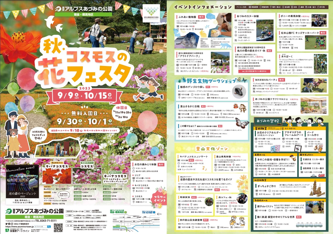 また、あづみの学校では9/16-17「アサギマダラのフレームdeアート」(各日先着10名、500円)や9/17「ぎっちょかご作り」(大人向け、300円、要予約)が実施されます。期間中開催のコスモスの押し花を使ってクリアファイルをデコレーションする「お花のクリアホルダー作成」もあるので行ってみると楽しそうです。