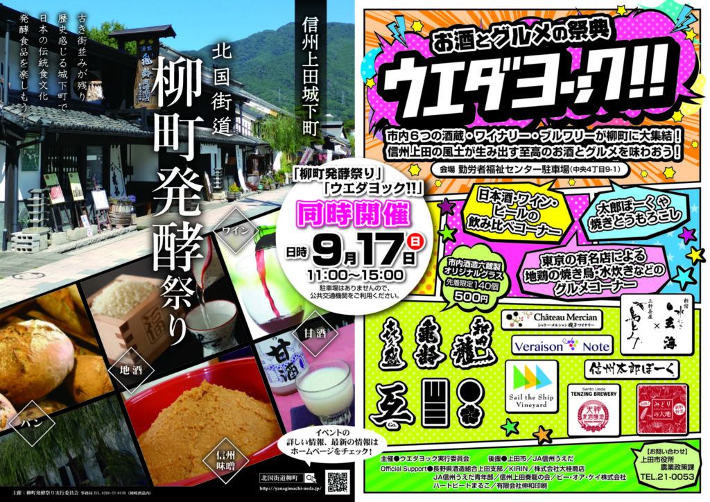 安曇野から車で約1時間の上田市柳町通りと勤労福祉センター駐車場を会場として9/17(日)11:00~15:00「柳町発酵祭り」と「ウエダヨック」が開催されます。