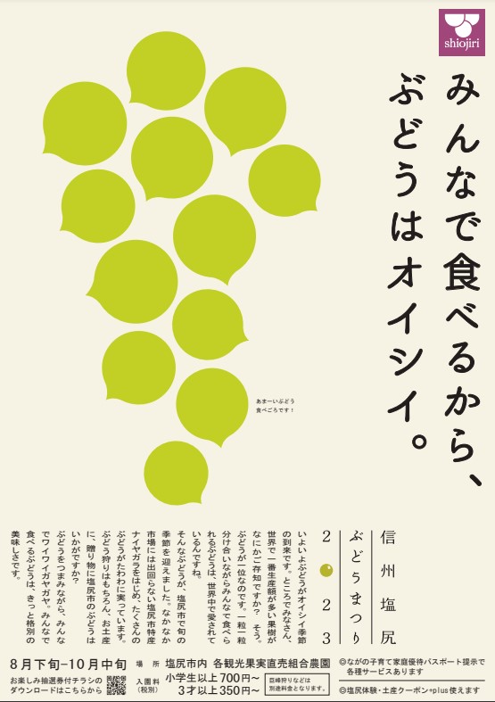 塩尻市特産のナイヤガラぶどうをはじめ8月下旬から10月中旬頃まで、塩尻市内の参加農園でぶどうを、自分で収穫しその場で楽しめる「信州ぶどうまつり」が開催されています。
