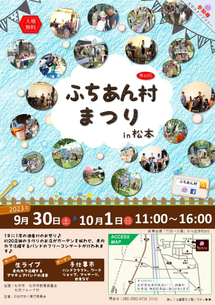 松本市寿北周辺、年に1度の淵庵村全部を使ったマルシェ「ふちあん村まつり」が9/30(土)-10/1(日)11:00-16:00に開催されます。
