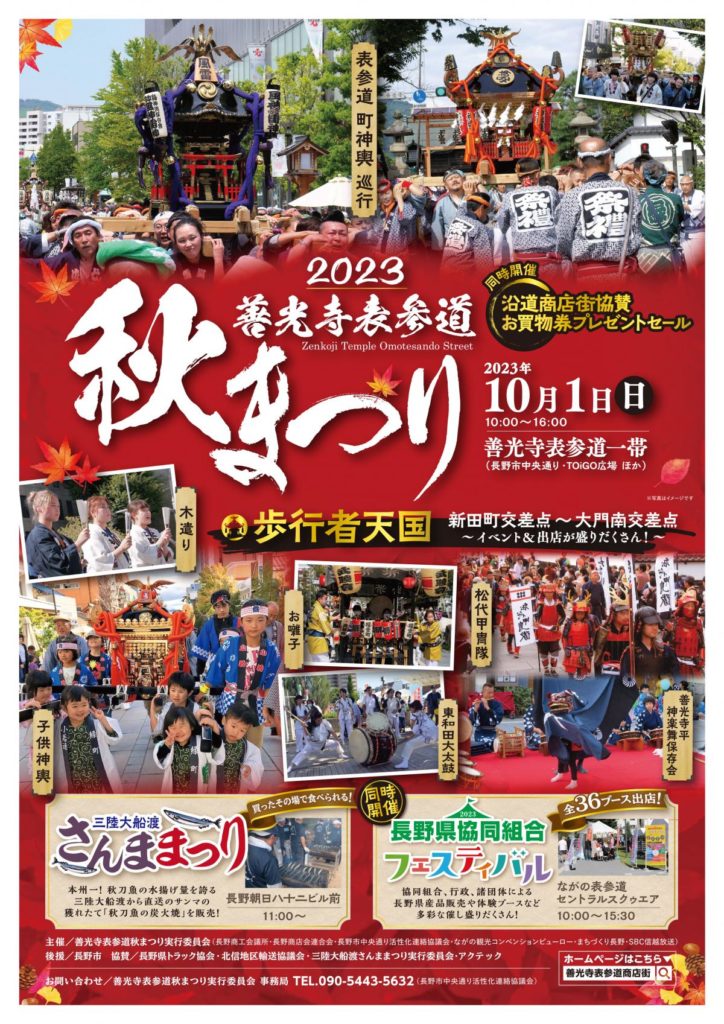 安曇野ICから長野ICまで高速利用で1時間程の長野市善光寺表参道では10/1(日)10:00~16:00「善光寺表参道秋まつり」が開催されます。