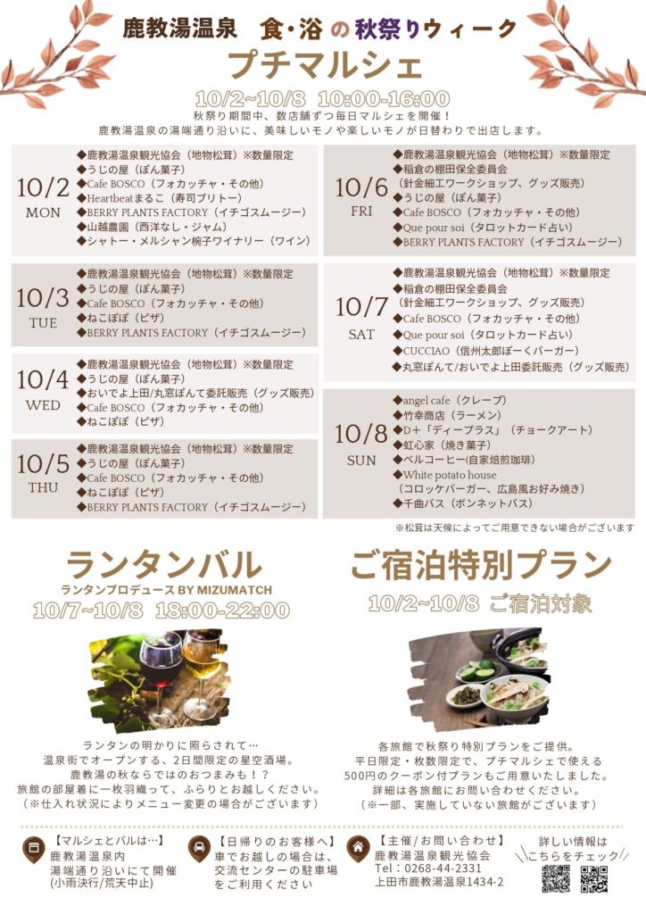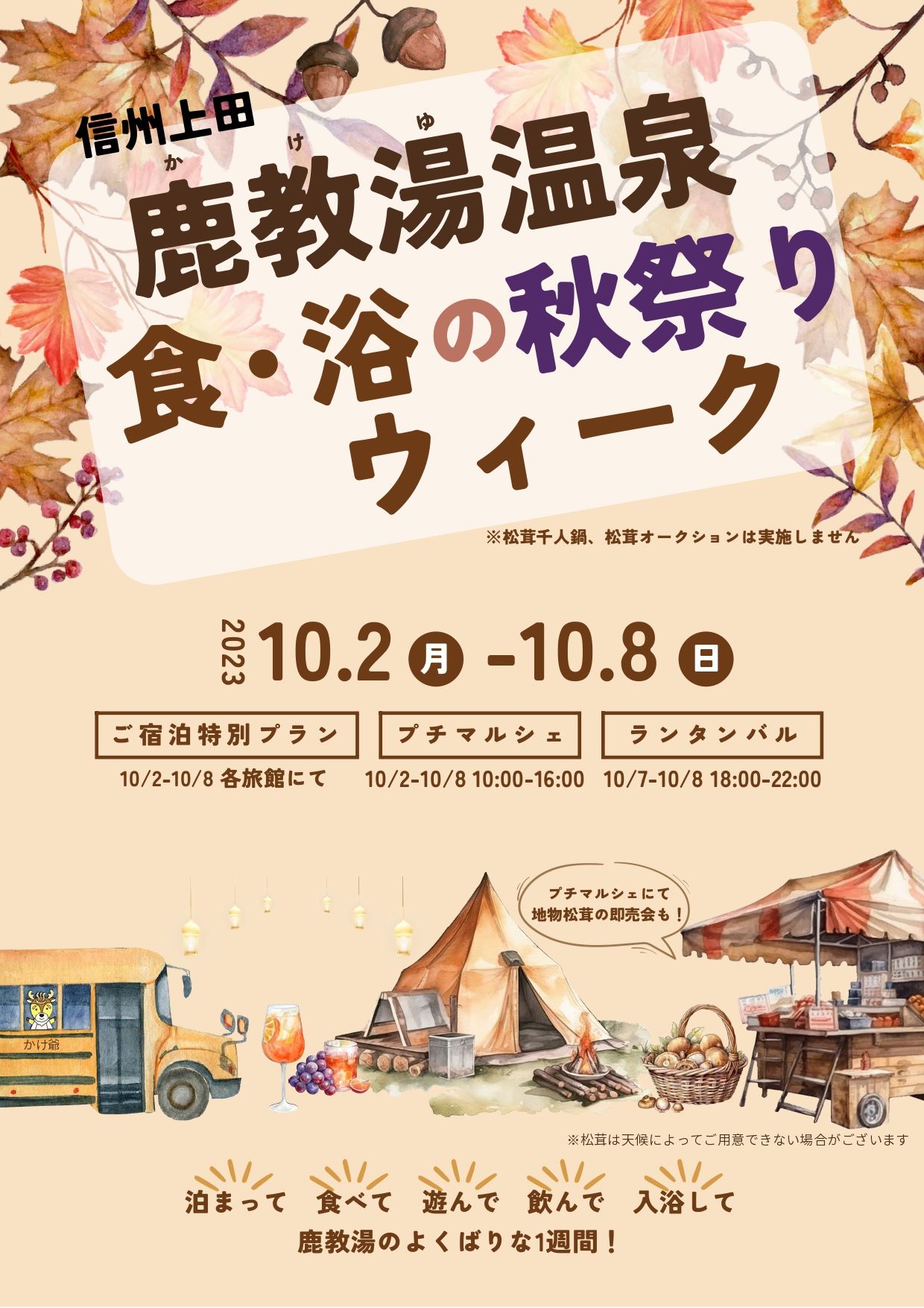 安曇野ICから車で40分程の鹿教湯温泉交流センター周辺では10/2(月)-8(日)「食・浴の秋祭りウィーク」を開催しています。