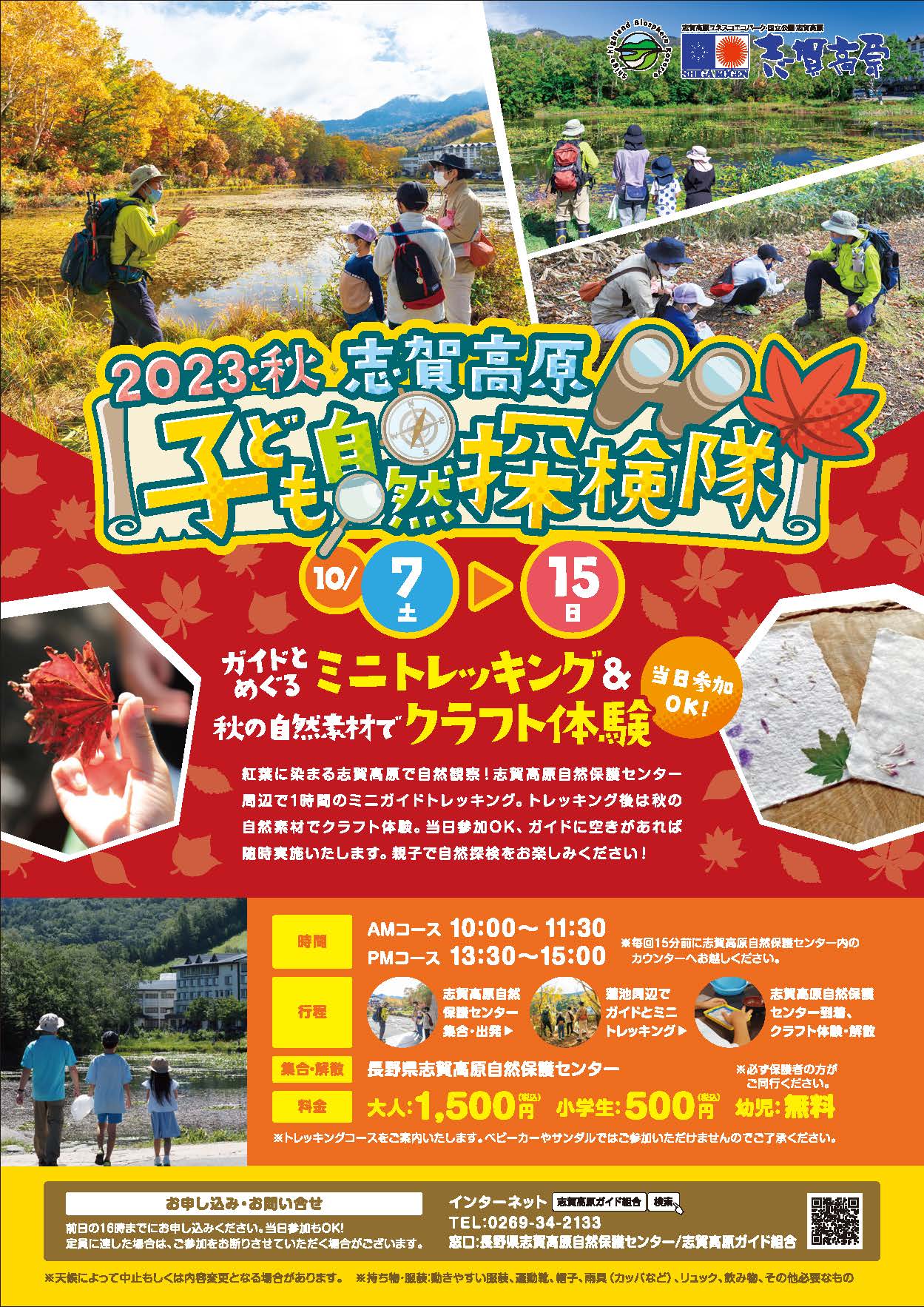 安曇野ICから信州中野ICまで高速利用で1時間25分程の志賀高原自然保護センターでは10/7(土)-15(日)ガイドと共にミニトレッキングやクラフト体験を楽しめる「子ども自然探検隊」を開催します。