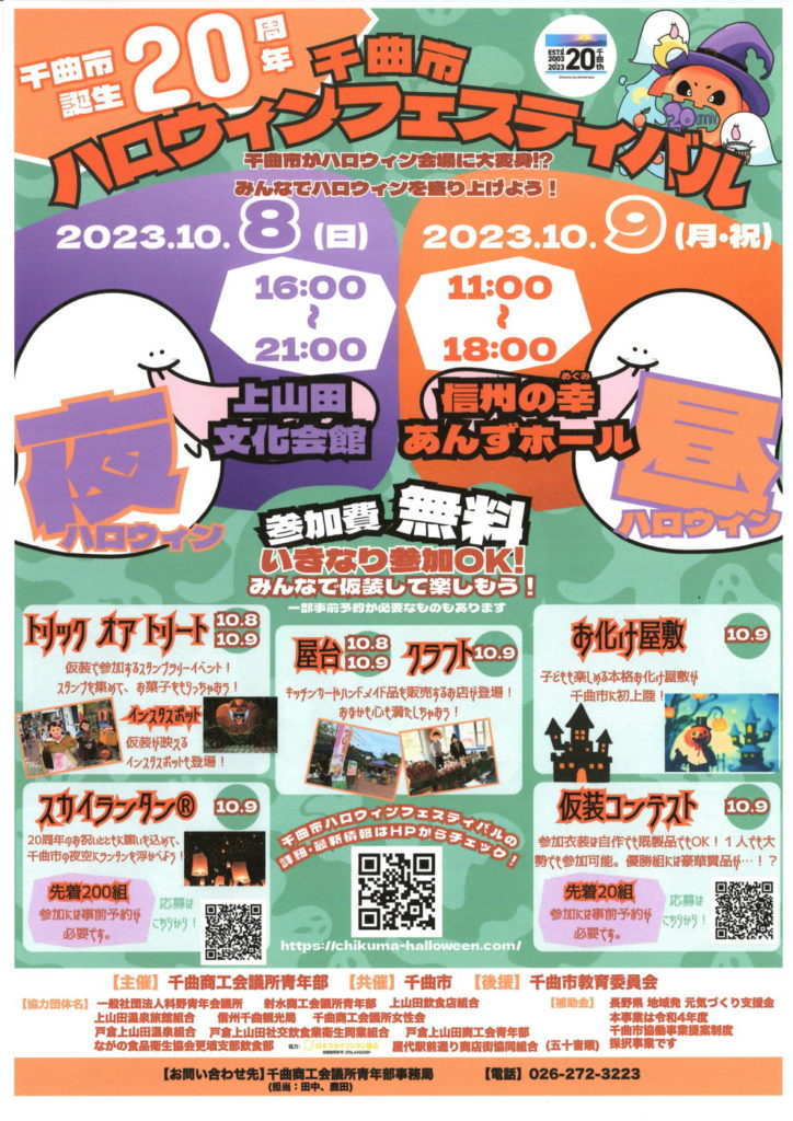 安曇野ICから姨捨スマートICまで高速利用で40分程の千曲市の各会場で10/8(日)-9(月)「千曲市ハロウィンフェスティバル」が開催されます。