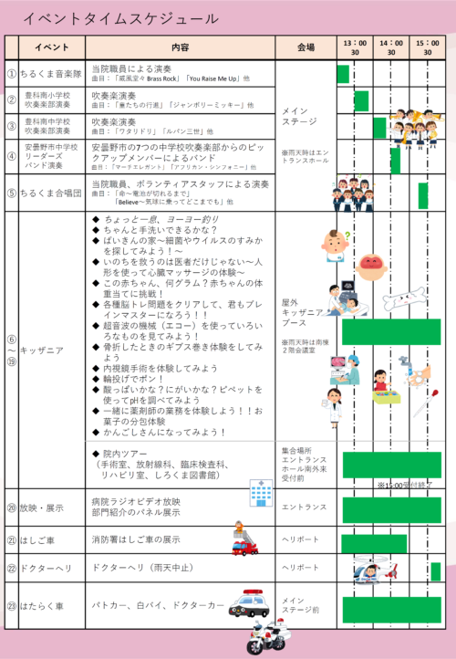 昨年とは異なり、講演会や出店等は無いようですが、職員や近隣の小中学校による演奏に病院ならではの手洗い確認が出来るイベントや赤ちゃんの体重あて、超音波エコーを使ったゲーム、ギブス巻きや内視鏡手術の体験など普段は出来ない体験が出来る催しが多く計画されています。