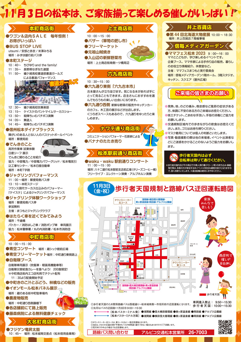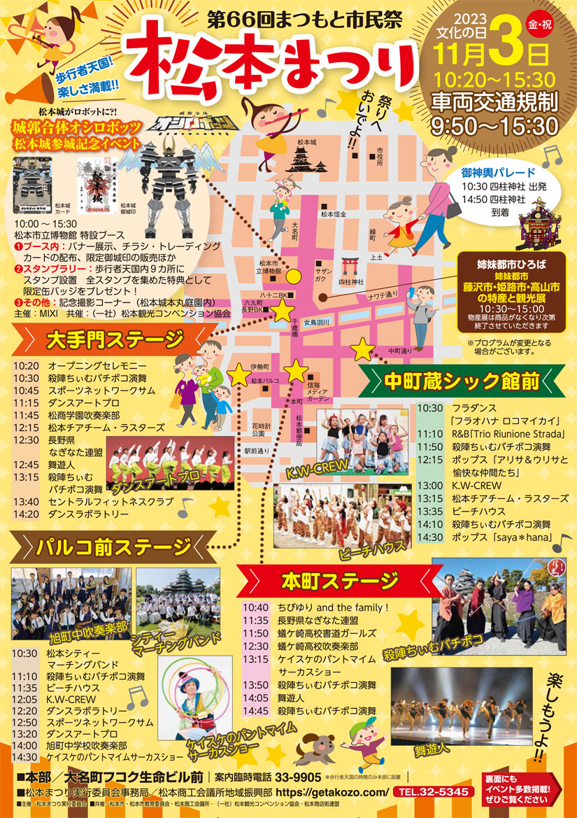 11/3(金祝)9:50~15:30松本市街地の一部を歩行者天国にして「まつもと市民祭 松本まつり」が開催されます。