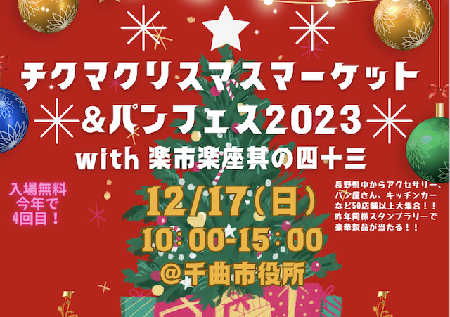 安曇野ICから更埴ICまで高速利用で40分程の千曲市市役所ガレリアやこもれびてらす等のスペースを利用し、12/17(日)、「チクマクリスマスマーケット&パンフェス2023with楽市楽座其の四十三」が開催されます。