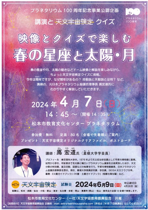 松本市教育文化センターでは4/7(日)14:45~15:45、天文宇宙検定も主催している天文宇宙教育振興協会とのコラボイベント「映像とクイズで楽しむ 春の星座と太陽・月」を開催予定です。