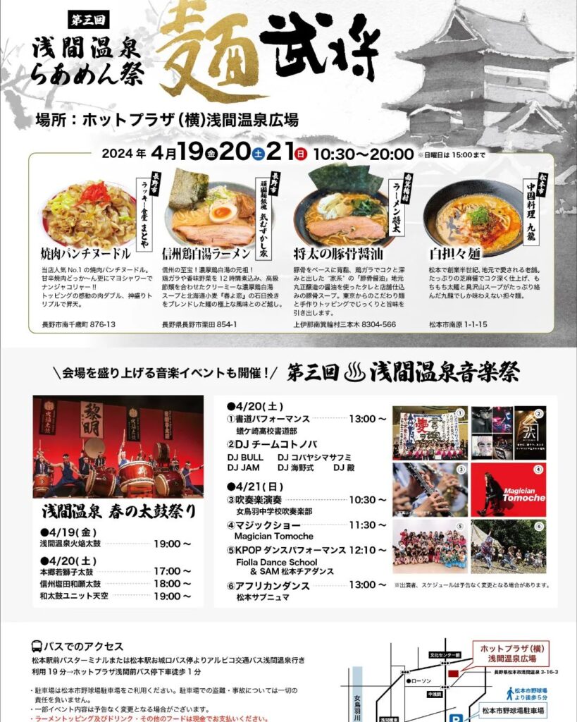 - 4/19(金)‐4/21(日) 浅間温泉らあめん祭&音楽祭@松本市ホットプラザ浅間