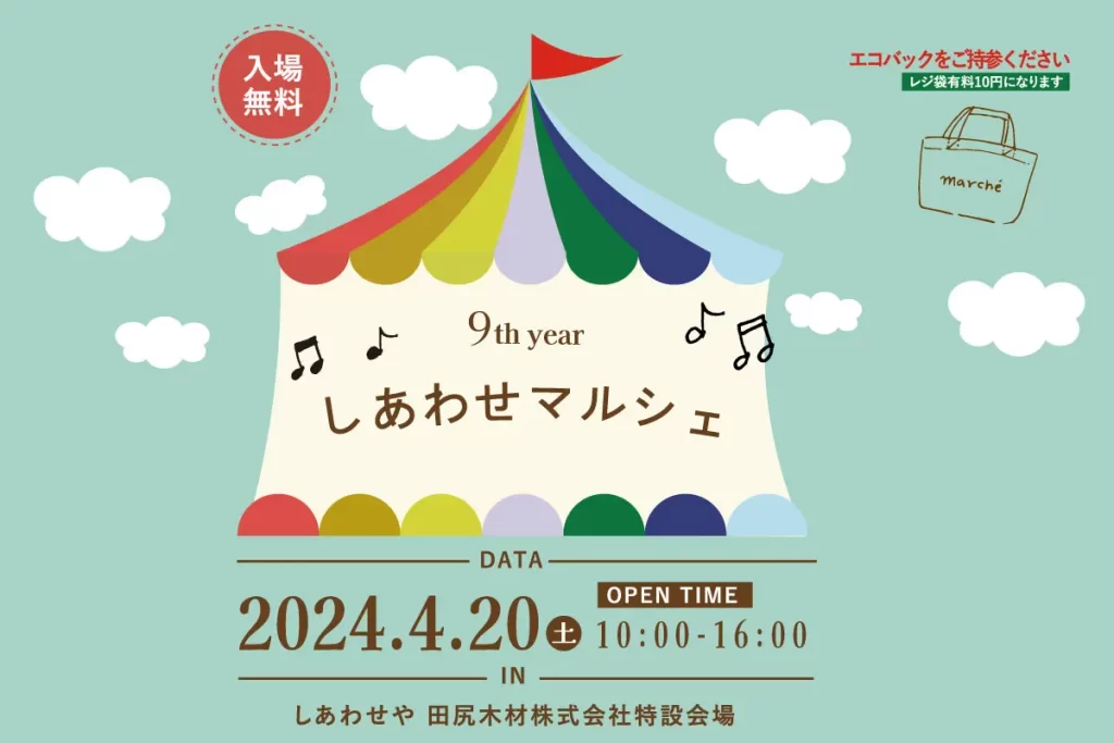 安曇野ICから須坂長野ICまで高速利用で50分程の長野市しあわせや田尻木材株式会社に設けられた特設会場で4/20(土)10時~16時、「しあわせマルシェ」を開催予定です。