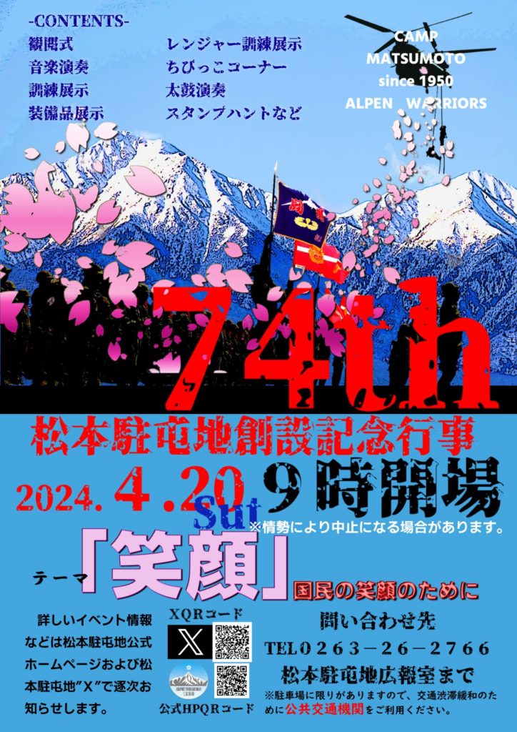 - 4/20(土) 創設74周年記念行事@松本市松本駐屯地