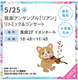 イオンモール松本では5/25(土)10:45~11:45弦楽アンサンブル「リアン」による「リトミック&コンサート」が開催されます。