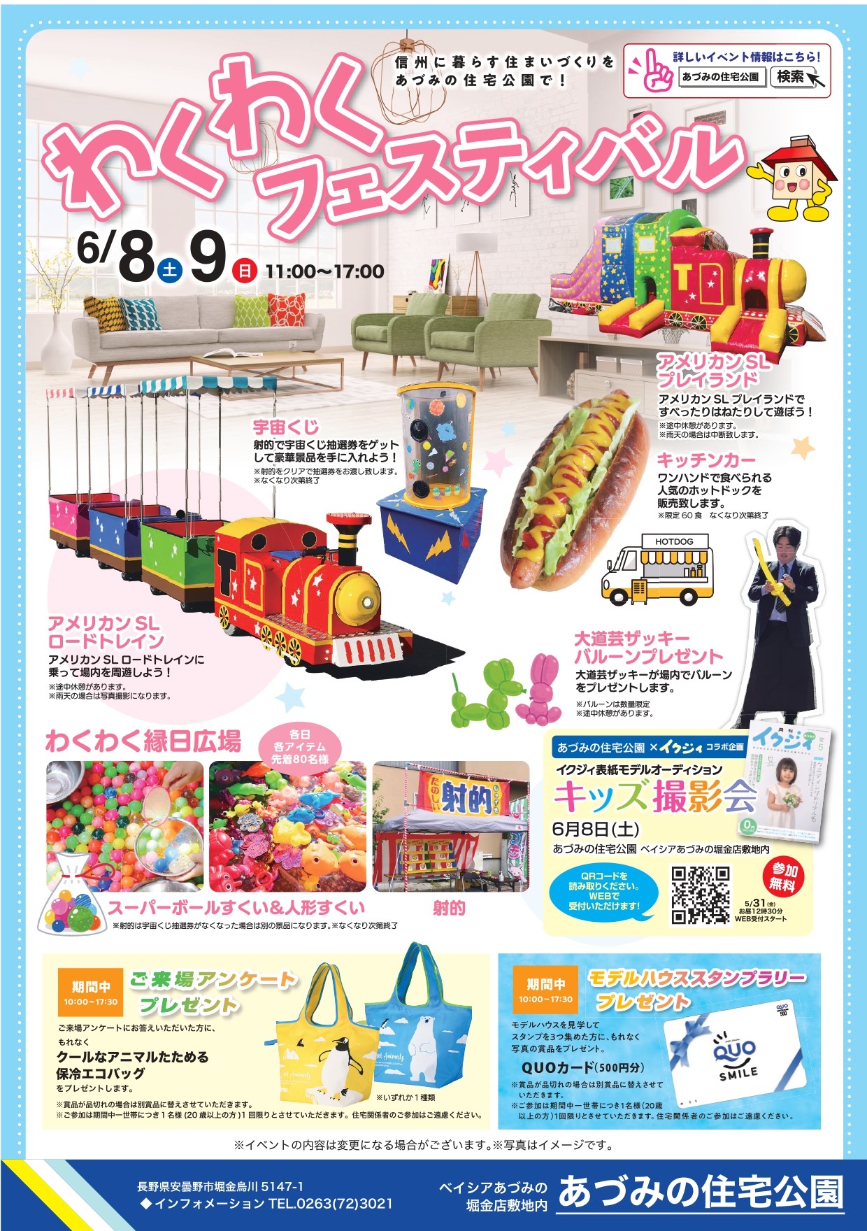 安曇野ICから車で12分程のあづみの住宅公園では6/8(土)-9(日)11時~17時「わくわくフェスティバル」が開催されます。
