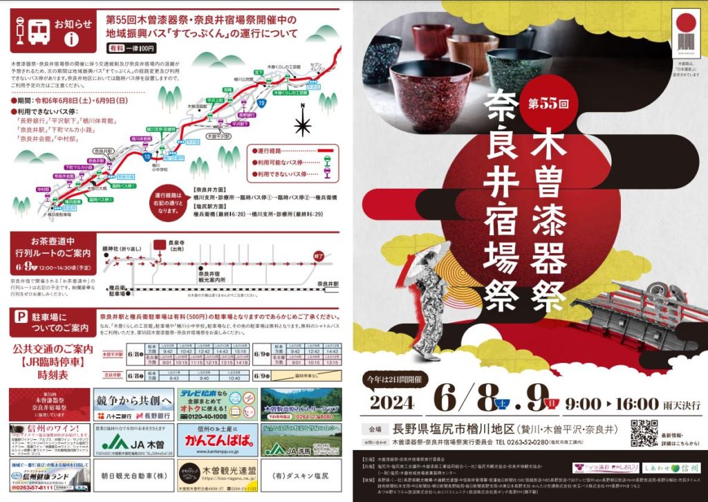 - 6/8(土)-9(日) 木曽漆器祭・奈良井宿場祭@塩尻市(木曽平沢・奈良井宿)