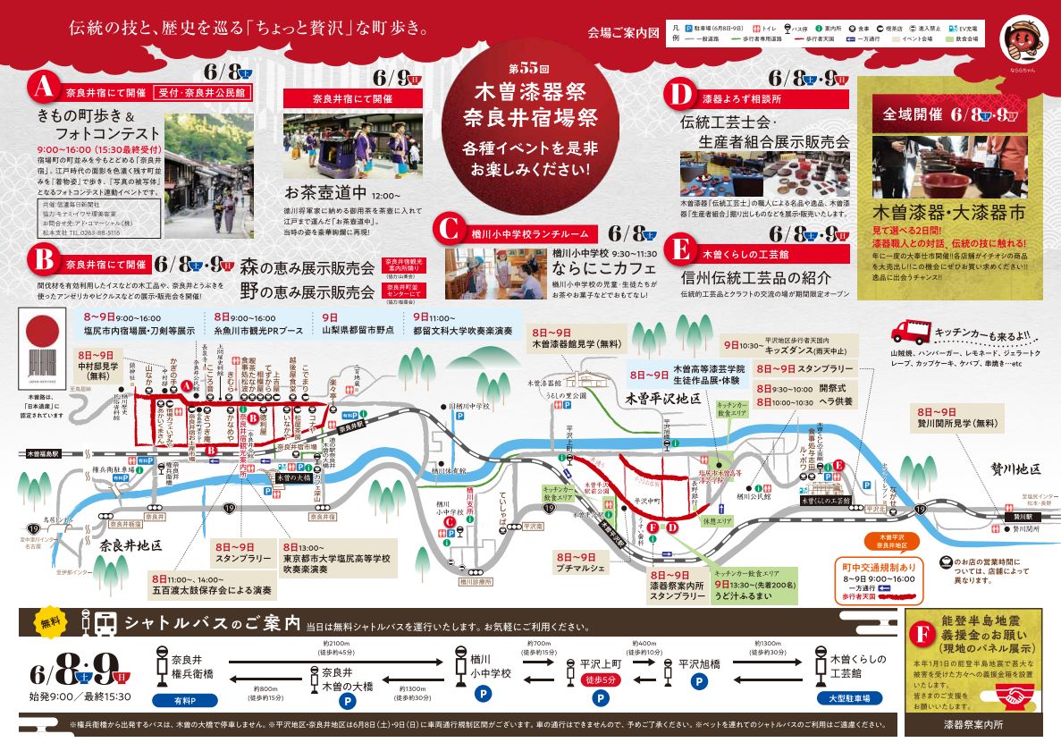 ※楢川小中学校や木曽くらしの工芸館等から無料シャトルバスも運行されています。