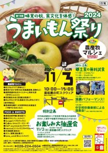 また、うまいもんまつりでも各種農産物やフードの販売にワークショップブースも多数出展予定で11時~にらせんべい、11時半~ひんのべ汁のふるまいもあるようなのでチェックして行ってみると楽しそうです。