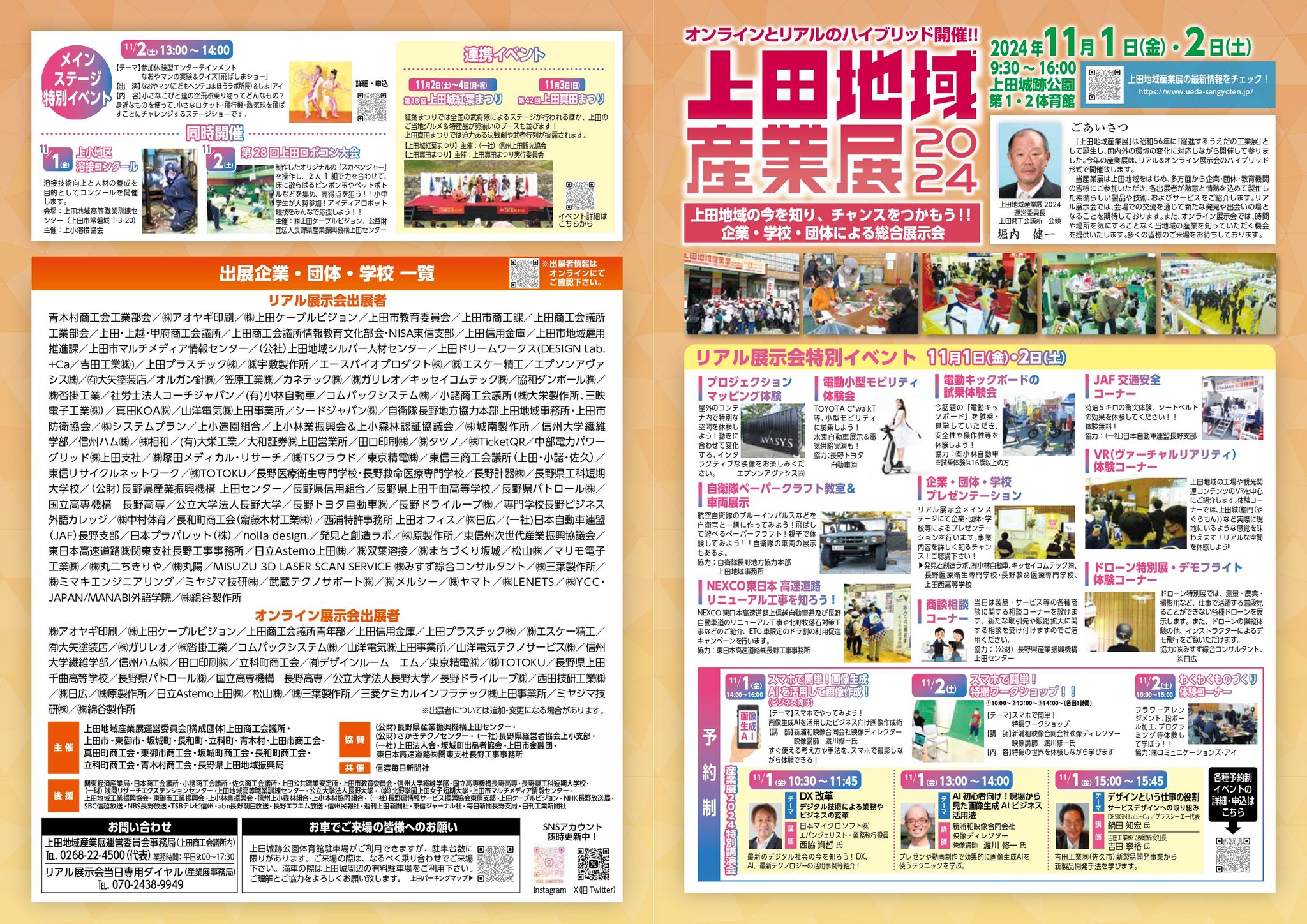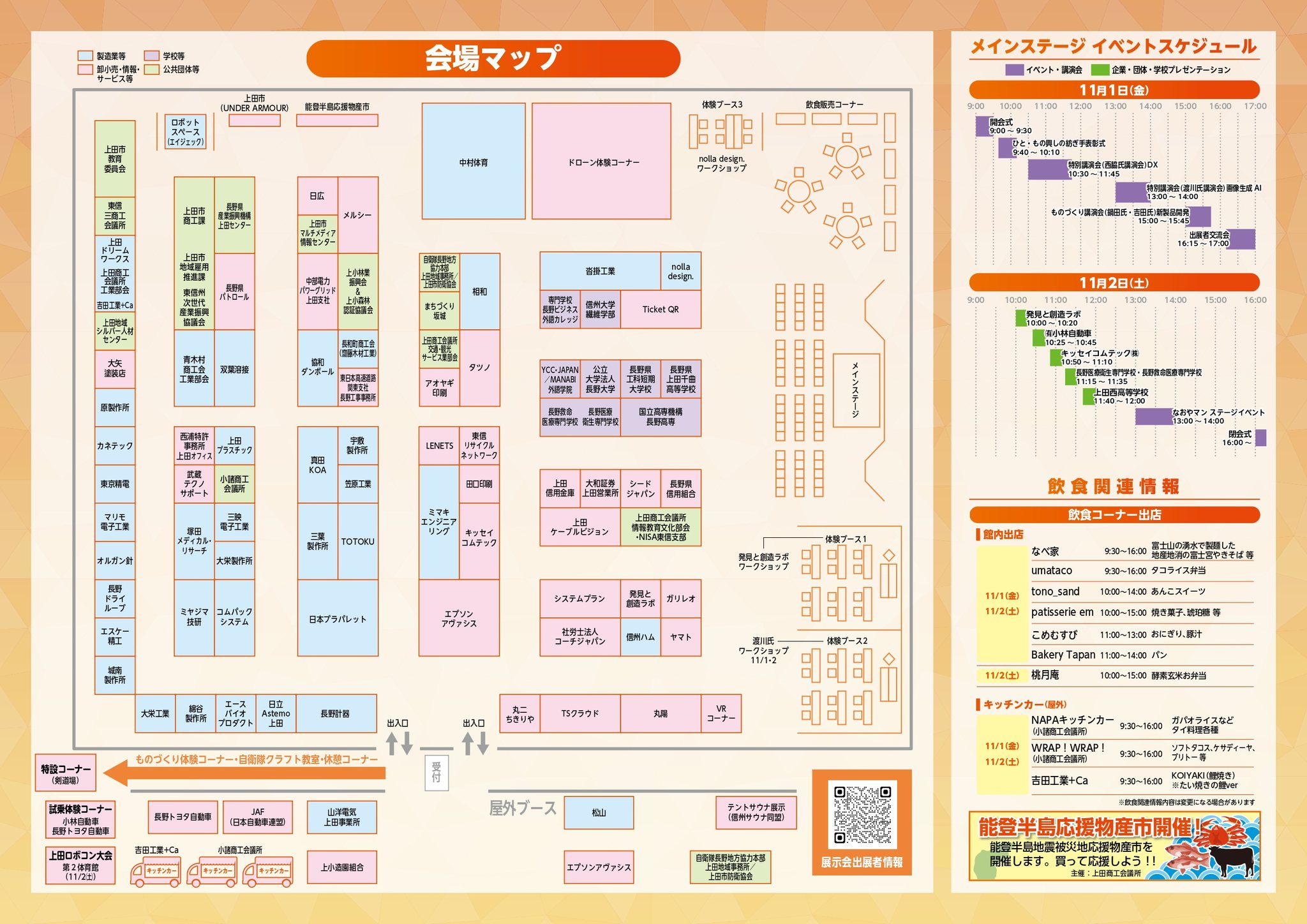 上田地域の企業や高校・大学ブースの出店の他モノづくり体験コーナーや自衛隊クラフト教室、各種ワークショップブースの出店がある他、キッチンカー等の飲食ブースも開設も予定されています。