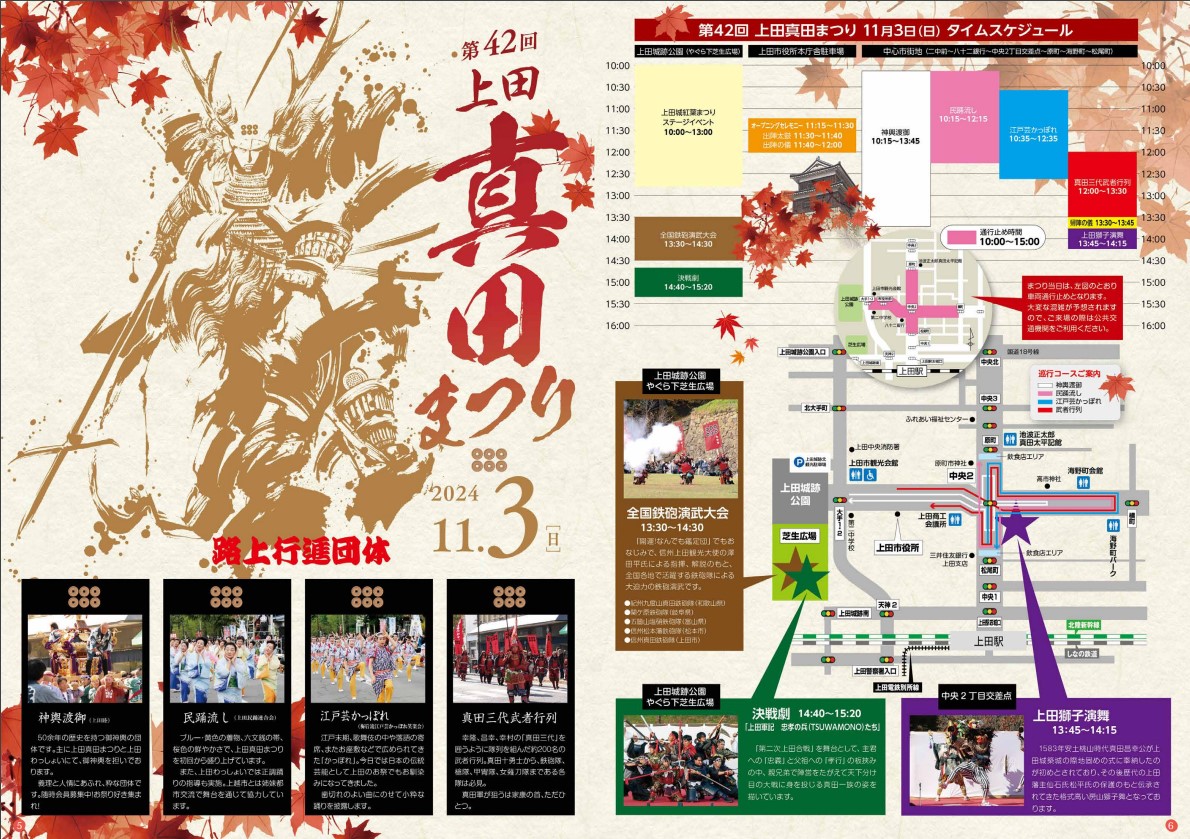 また、同時開催として11/3(日)10時~15時半は「上田真田まつり」が開催され市内が戦国自体に戻った様に賑わい、11/4(月祝)10時~14時半は「上田城太鼓まつり」として迫力の太鼓演奏を鑑賞することも可能です。
