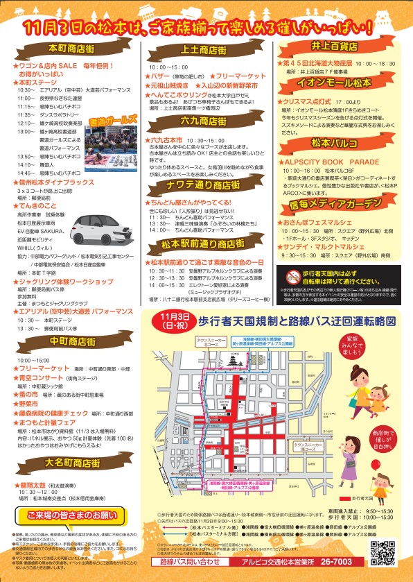 11/3(日)9:50~15:30松本市街地の一部を歩行者天国にして「まつもと市民祭 松本まつり」が開催されます。